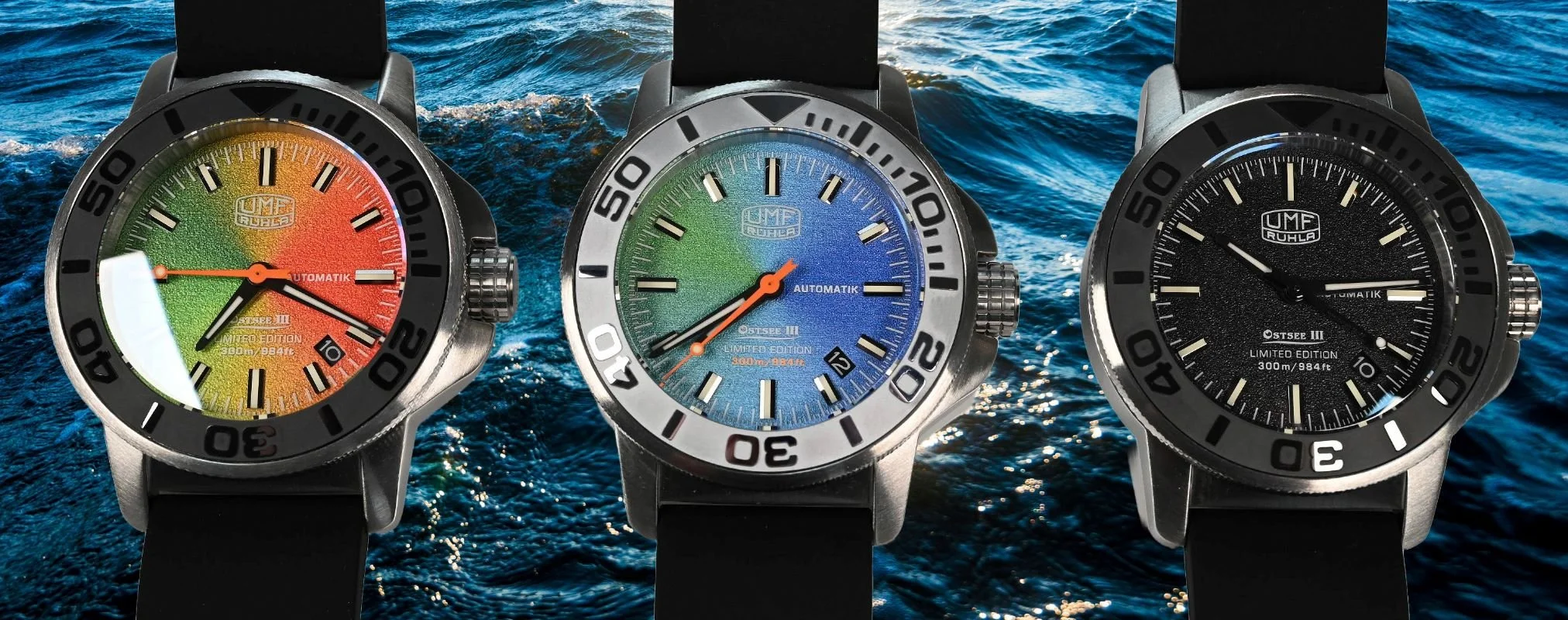 Bis auf die Riffelung der Krone, entsprechen die Uhren 1 zu 1 den ersten Grafiken, inklusive der Lünetten Farbe, Ostsee 1 Silber, Ostsee 2 und 3 schwarz.